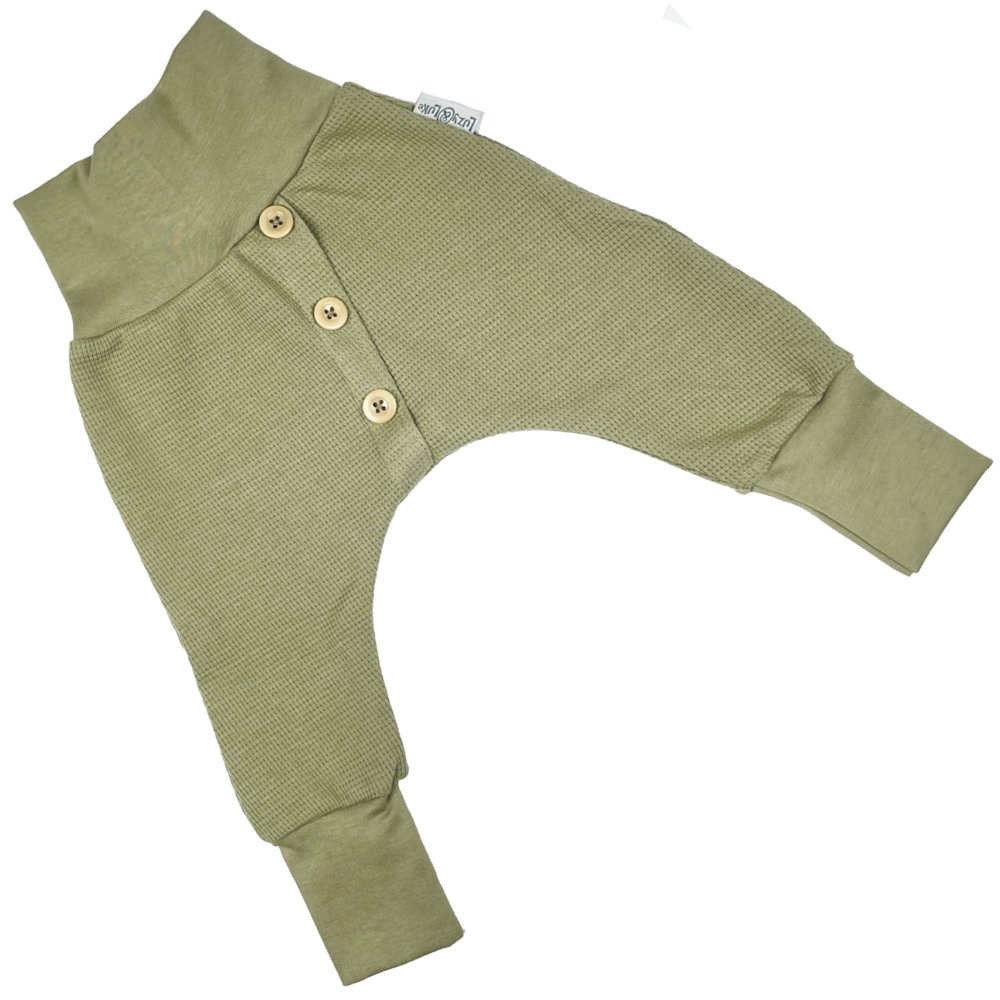 Diese Hose aus Waffel-Jersey ist bequem und locker geschnitten. Die Fake-Knopfleise ist ein besonderer Hingucker und die Knöpfe werden von uns von Hand angenäht. Sie wächst über 3 bis 4 Kleidergrößen mit und bietet sogar genug Platz für eine Stoffwindel. Die ca. 10 cm hohen Bündchen können bei Bedarf umgestülpt werden, was die Hose verkürzt – werden die Bündchen ausgeklappt, wird die Hose länger. Auf der Innenseite des Taillenbunds ist eine kleine Öffnung eingearbeitet, in die noch ein Gummiband eingezogen werden kann – falls der Bund etwas zu weit ist. Der geringe Elasthan-Anteil sorgt für verbesserte Formbeständigkeit und angenehmeren Tragekomfort.
